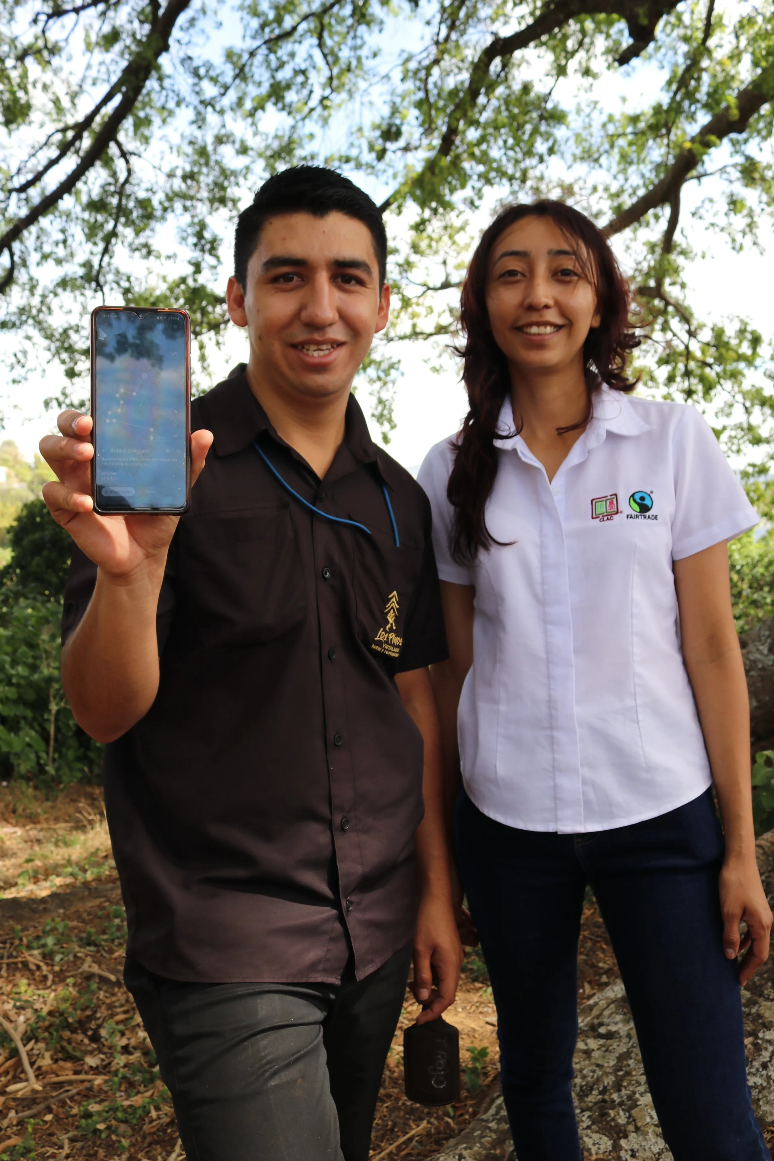 Felix Menjivar (technician for EUDR geolocation data) and Claudia Jimenes (CLAC Country Manager for El Salvador) show how geolocation data collection works.
