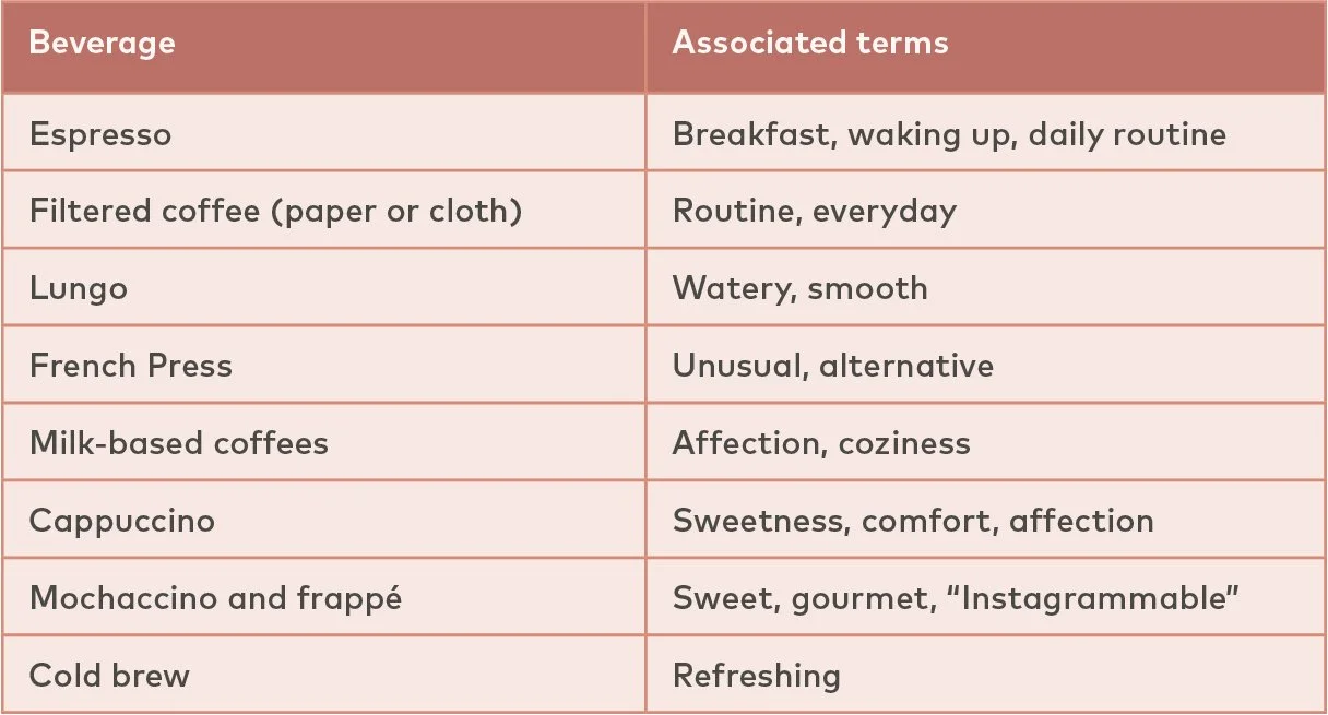 A table showing coffee beverages and the descriptive words and experiences that study participants associated with them.