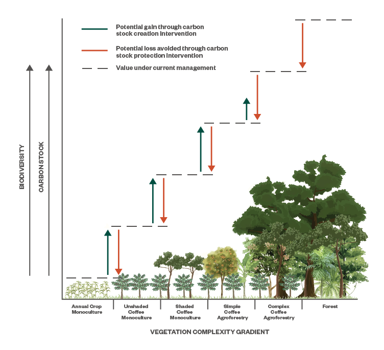 Figure 2. Conceptual representation of potential carbon gains and losses across the coffee management gradient. Blue arrows indicate potential carbon sequestered by adding shade trees to each system type. Red arrows indicate potential carbon losses from removing existing shade. The height of the horizontal dotted lines show the biodiversity and carbon stock value of each vegetation system, under current management. The depicted scale of carbon and biodiversity changes are illustrative, not hypothetical or data-driven. Credit: Emily Pappo et al., 2025.
