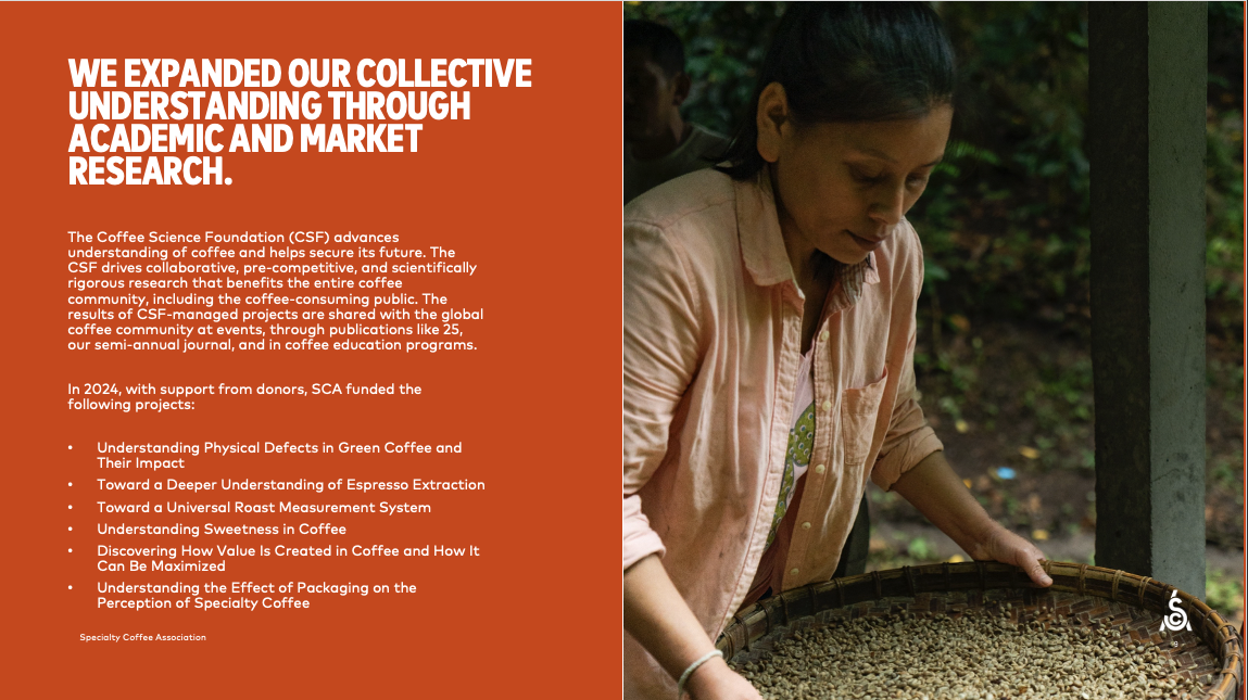 2024 was an eventful and important year for us at the Specialty Coffee Association (SCA). Over the year, we adopted and published the remaining standards for our Coffee Value Assessment, officially replacing the 2004 Cupping Form, brought World of Coffee to Asia and announced its first iteration in a coffee producing country. Dive in to the newly published 2024 SCA Annual Report